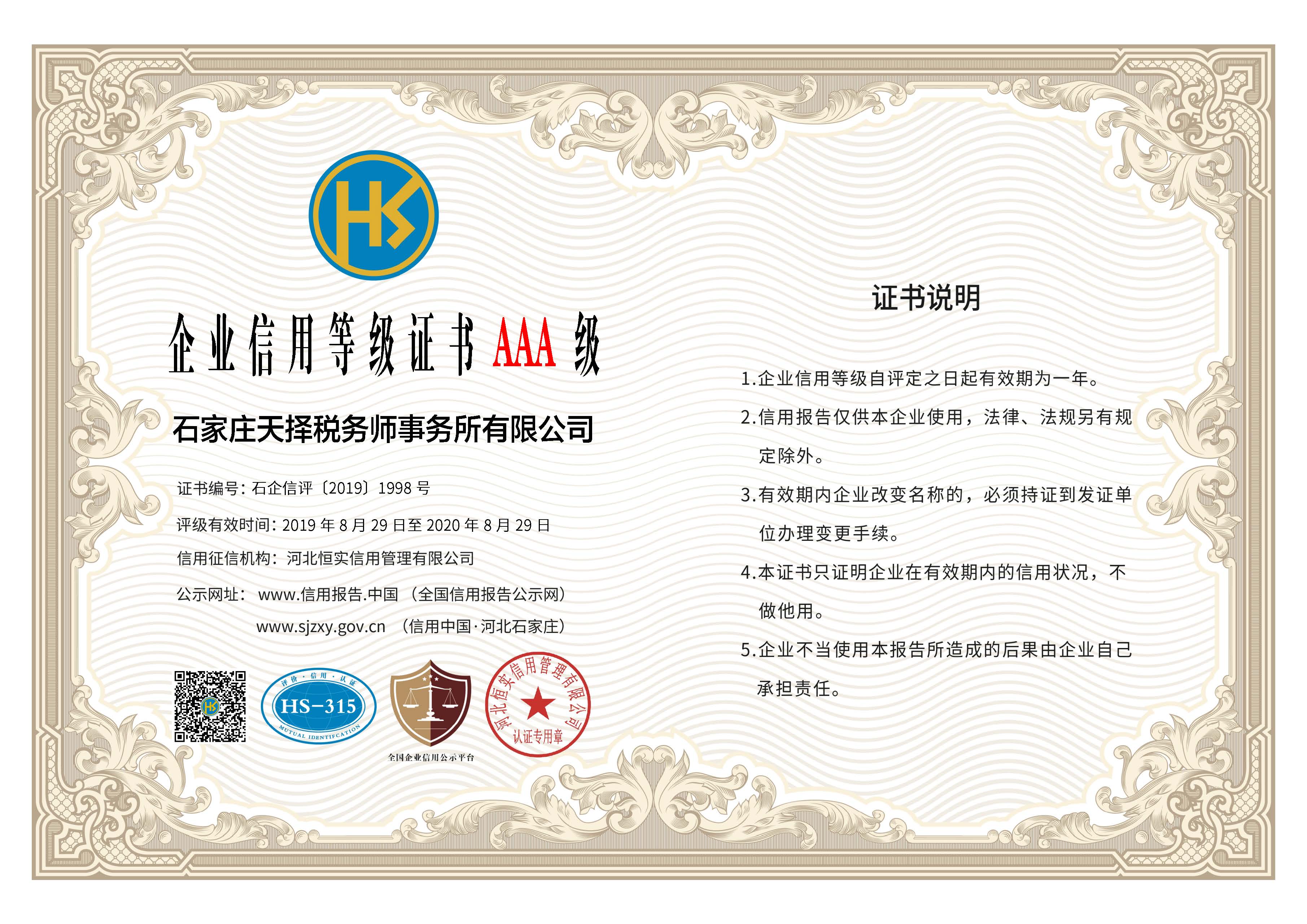 石家莊天擇稅務(wù)師事務(wù)所有限公司始終堅(jiān)持誠(chéng)信為本,服務(wù)至上的經(jīng)營(yíng)方針,此次信用等級(jí)評(píng)定,由企業(yè)自主申報(bào),河北恒實(shí)信用管理有限公司對(duì)公司財(cái)務(wù)、納稅、執(zhí)業(yè)資質(zhì)、行業(yè)榮譽(yù)、合同履行及社會(huì)責(zé)任等方面進(jìn)行綜合評(píng)審,經(jīng)多方評(píng)估后,最終評(píng)定公司“AAA級(jí)”信用等級(jí),為最高信用等級(jí)。