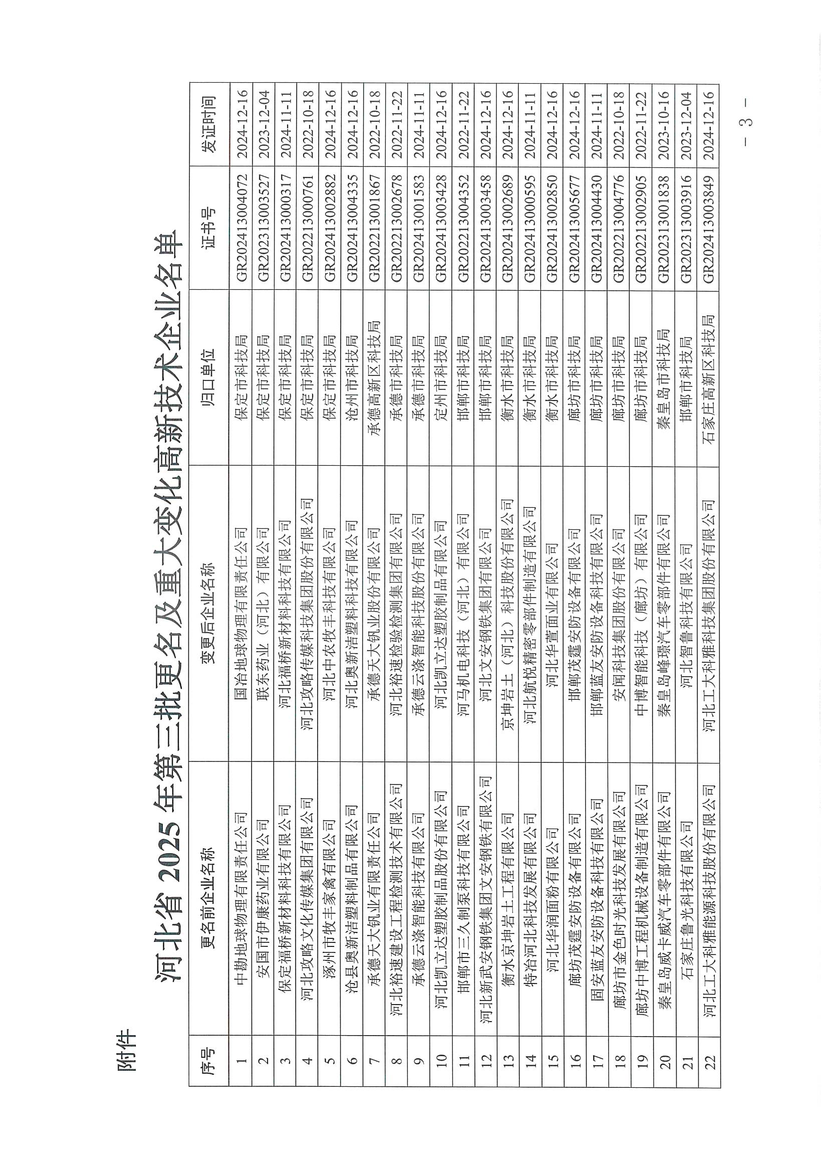 關于公布河北省2025年第三批更名及重大變化高新技術企業(yè)的通知
